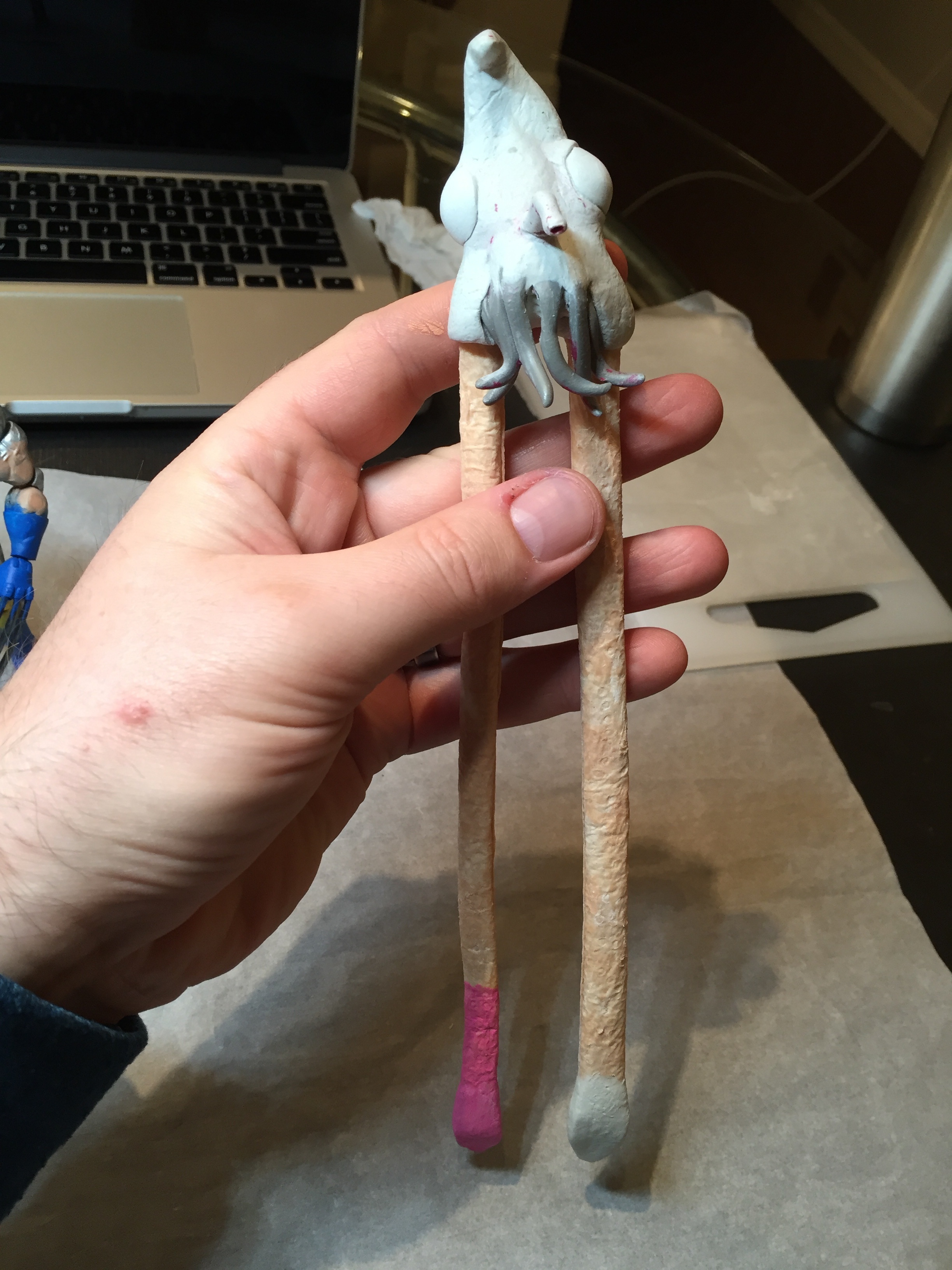 the 2 large tentacles are bendable and can hold their shape very well. it started by making a fake skin out of liquid latex and paper towel. i then super glued it as i rolled the skin around a wire. i did this in small sections at a time to ensure the glue was getting a good, firm hold on the core wire. once to my desired thickness i sculpted a tip on the end of both tentacles, then connected them to the body of the squid (using glue, toothpicks and apoxie sculpt). then i glued the squid to the body and secured it with apoxie sculpt. finally, i used elastic bands as the belts on the torso with a bit of sculpt for the buckle.