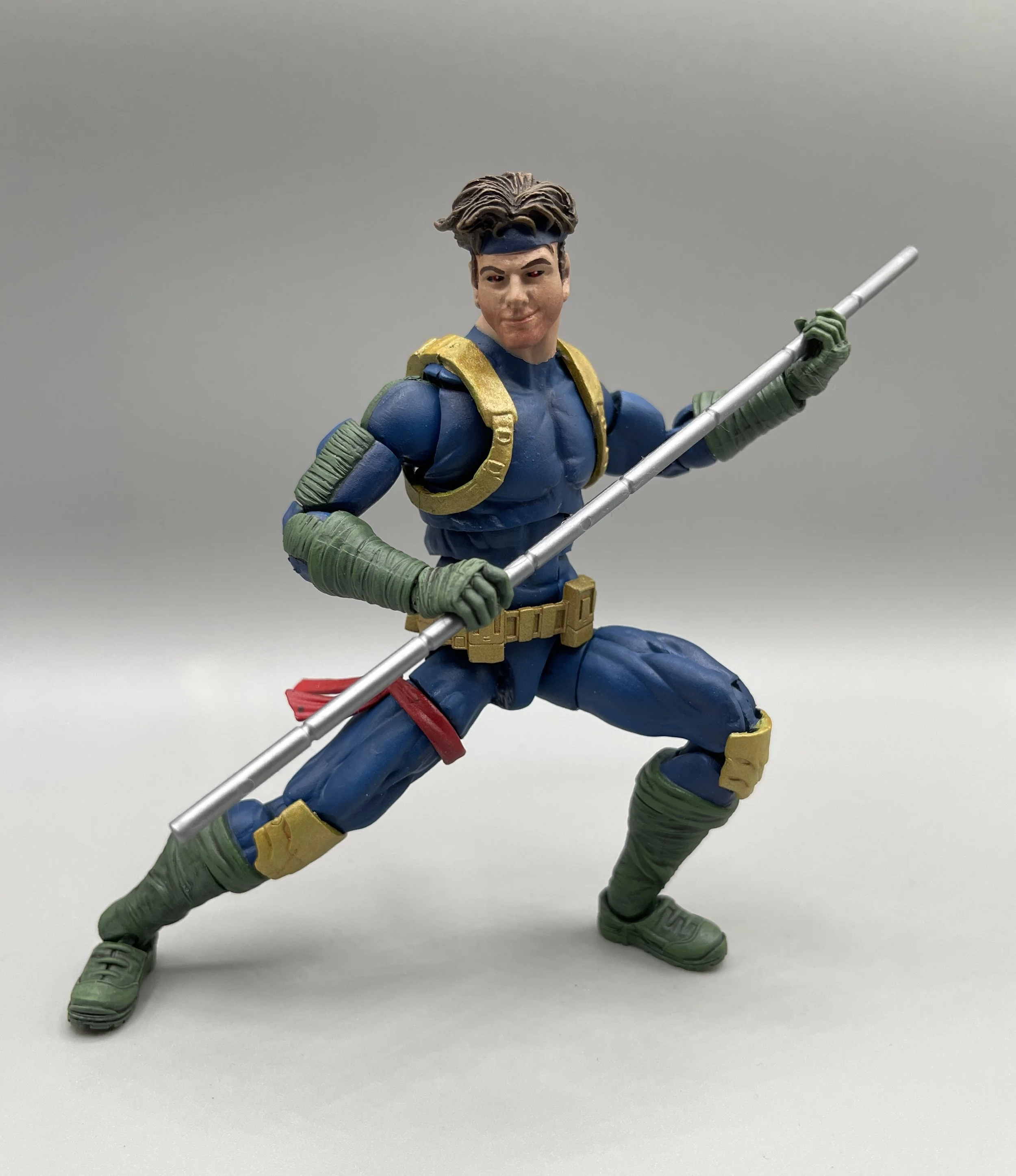 Age of Apocalypse Gambit was made using a Retro Ben Reilly Spider Man body with Daredevil (from SP/DR wave) lower arms, Hobgoblin BAF knees, Netflix Daredevil Feet. I can’t recall where the shoulder harness is from, but the belt is a Clone Trooper, his cape is from Odinson Thor, leg sash from Night Thasher and head from the old Toybiz Marvel Legend Gambit.
