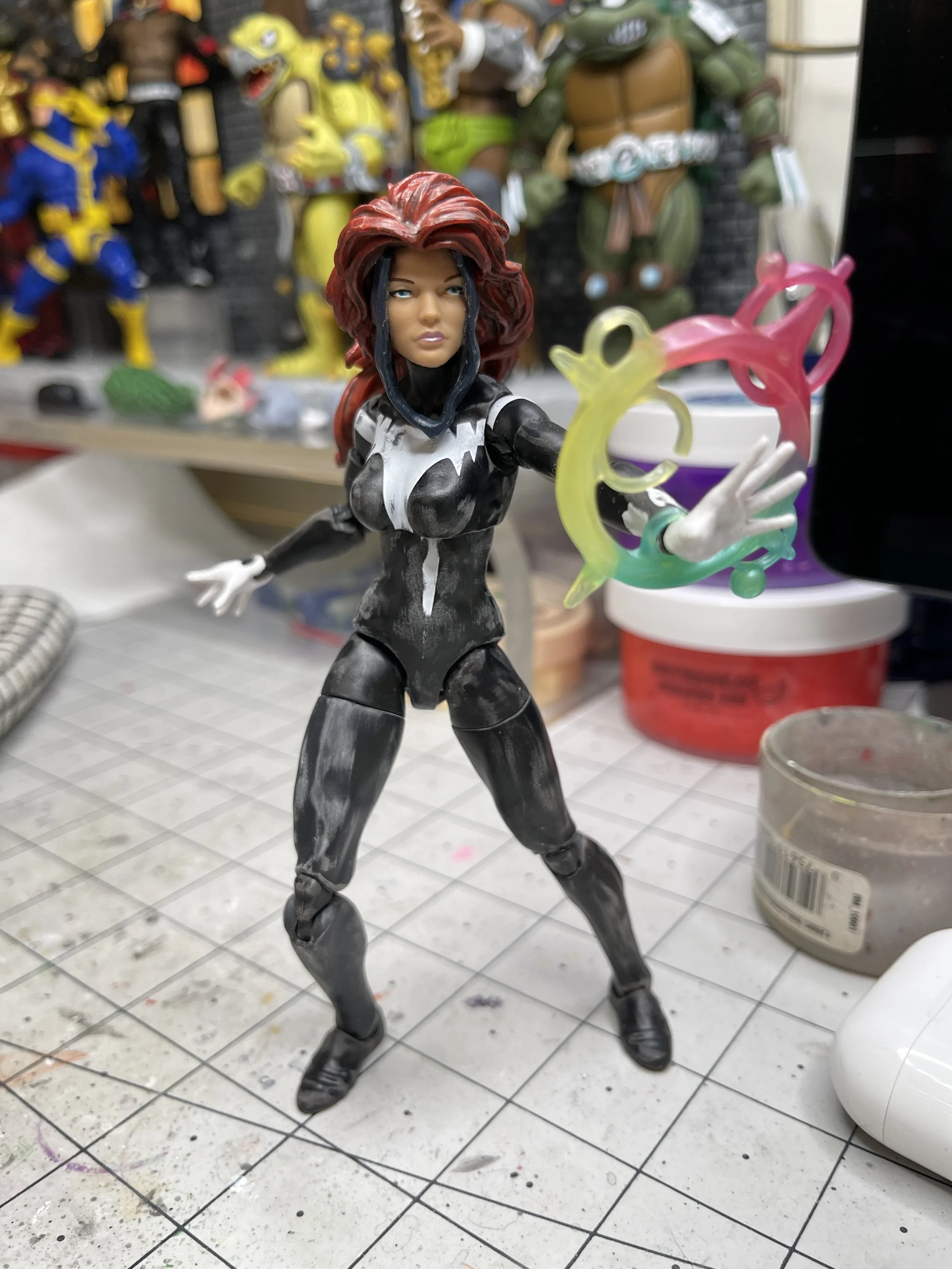 Age of Apocalypse Dazzler was made using a Shriek base body, a hood from Taskmaster, head from Songbird (I think?) and hair from the old Jean Grey from the Rocket Racoon BAF wave. Details sculpted using Apoxie Sculpt and painted using P3, Citadel and Vallejo paints.