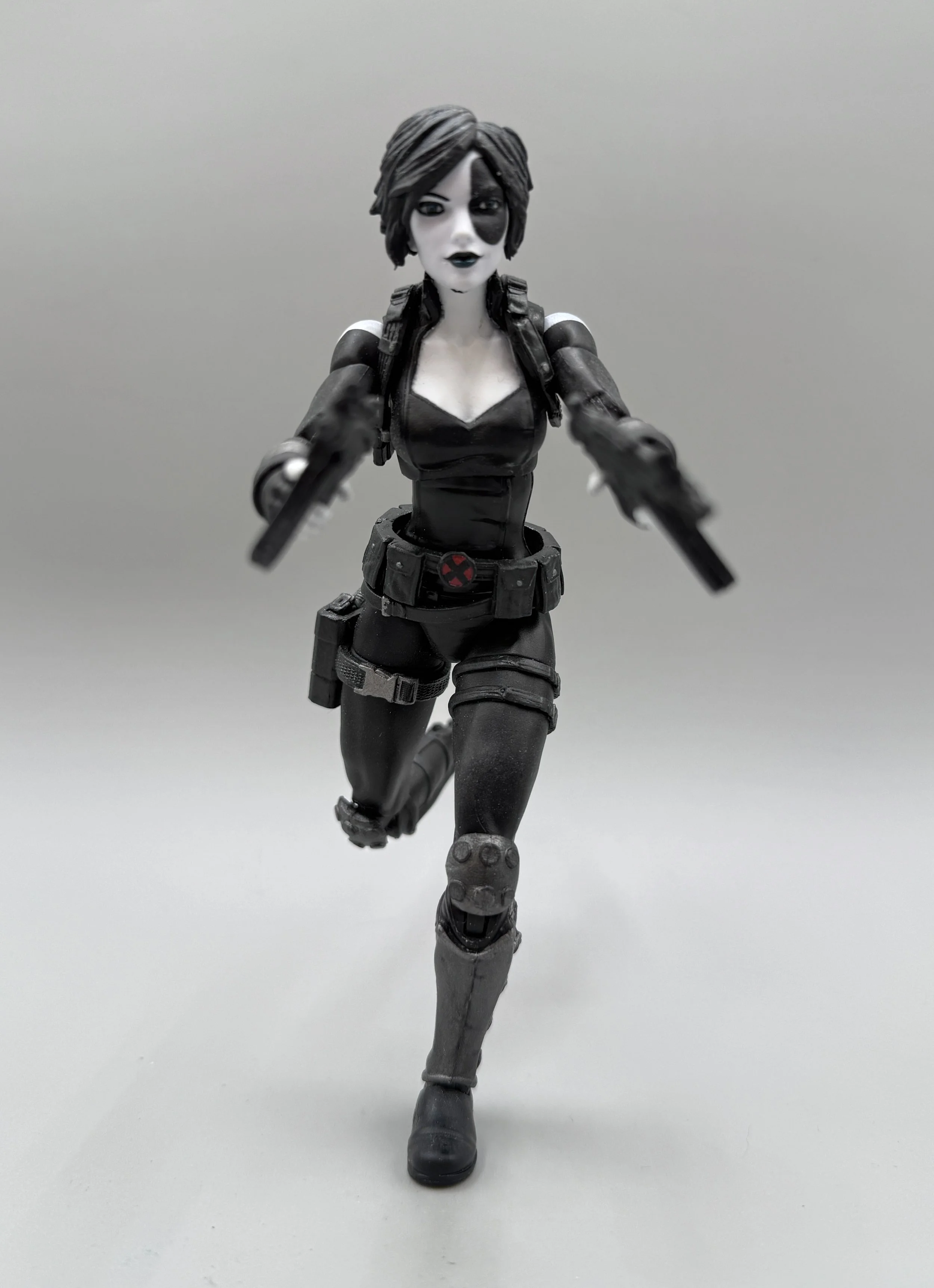 Here is a quick and easy Uncanny X-Force Domino. She’s basically the old Domino figure with swapped out arms and legs for double jointed, pinless look. I gave her some new weapons, new belts, straps and holsters, did some minor sculpting on her gauntlets and slapped some paint on them and boom, done! Pretty happy with this one considering how simple she was.